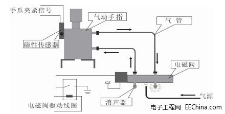 注:上图中手爪夹紧由单向电控气阀控制,当电控气阀得电,手爪夹紧,当电控气阀断电后, 手爪张开。
